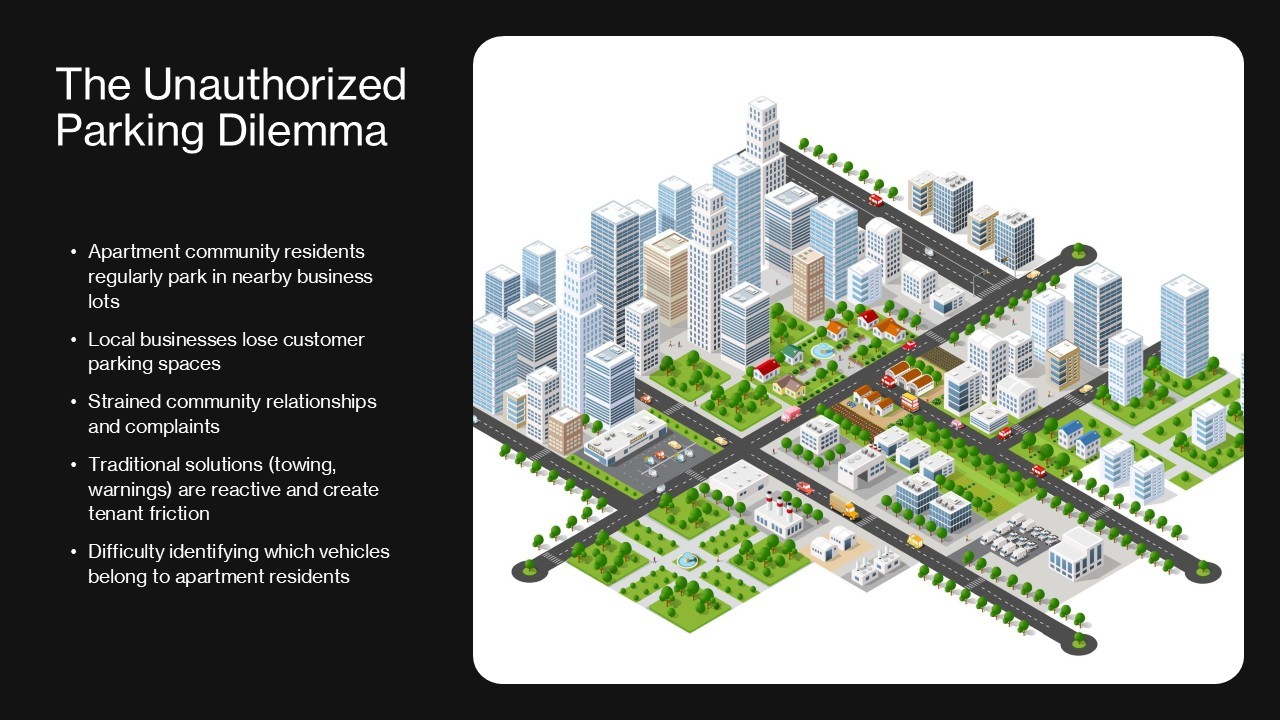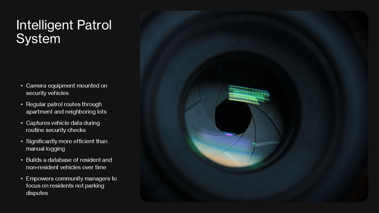 As apartment communities and neighboring businesses struggle with unauthorized parking, unregistered vehicles, and potential lease violations, ParkGuard provides property managers with unprecedented visibility into vehicle activity. By combining advanced AI identification technology with mobile surveillance capabilities, our system creates a comprehensive security solution that addresses multiple pain points for apartment community managers.